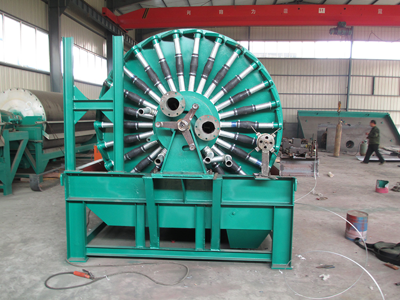 筒體內部裝有鍶鐵氧體永久磁係,可促使磁性顆粒迅速吸附到濾布表麵,由於是上部給料,使得濾餅中精礦按粒度分層的效果更加明顯,當磁性精礦形成濾餅時,顆粒同時受到重力和磁力的作用,粗顆粒精礦比細顆粒精礦向濾布運動的快,精粒首先接觸濾布,故濾餅的透氣性好,而且礦漿中磁性顆粒在磁力吸引下呈放射狀布於圓筒表麵,並由於磁係極性變化而產生磁攪動作用,這都成為濾餅易脫水的有利條件,使得濾餅厚且透氣性好,顯著地提高了生產率,與同規格的筒形真空過濾機相比,其效率提高三倍以上。