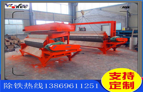 4、含有鐵磁性雜質的物料通過受料鬥經電磁振動給料機均勻的下到第一道輸送皮帶上,當物料通過強磁輥時,鐵磁性物質被磁力吸引被吸附到強磁輥上,隨著皮帶的轉動使其從磁場脫離並落入收集鬥中。其它物料和沒有選淨的鐵磁性物質隨溜槽進入下一級磁選皮帶進行分選,原理同上。最後選出合格的產品。